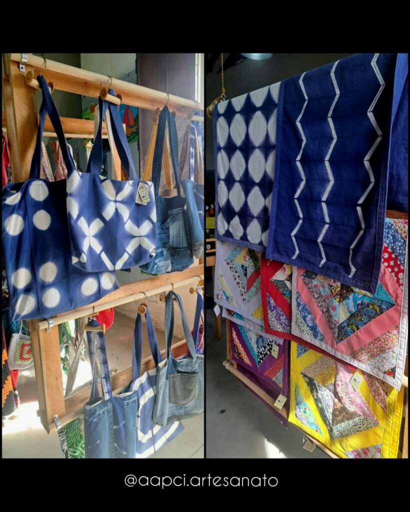 Me especializei em cartonagem, costura criativa com reaproveitamento de jeans, colchas de retalhos e peças tingidas com a técnica japonesa shibori.